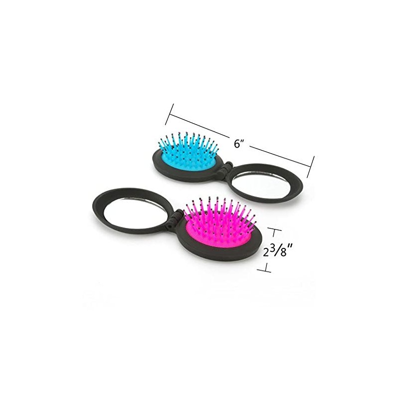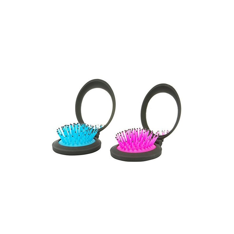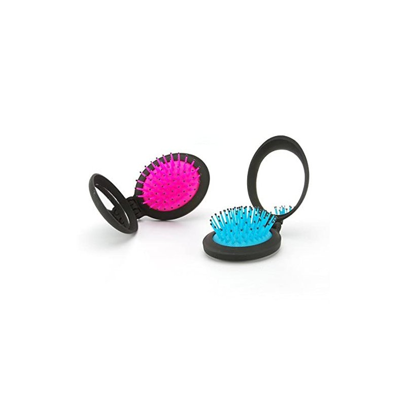 - *Two piece foldable mirrored mini hairbrush set; fuchsia pink, aqua blue