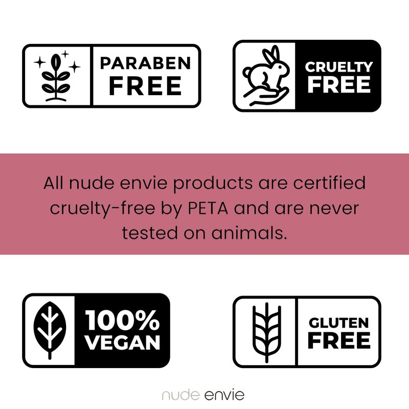 - Certified Vegan, Cruelty-Free, and Paraben Free- Nude Envie is carefully crafted using the finest ingredients. All products are certified vegan, cruelty-free, paraben-free, and gluten-free.