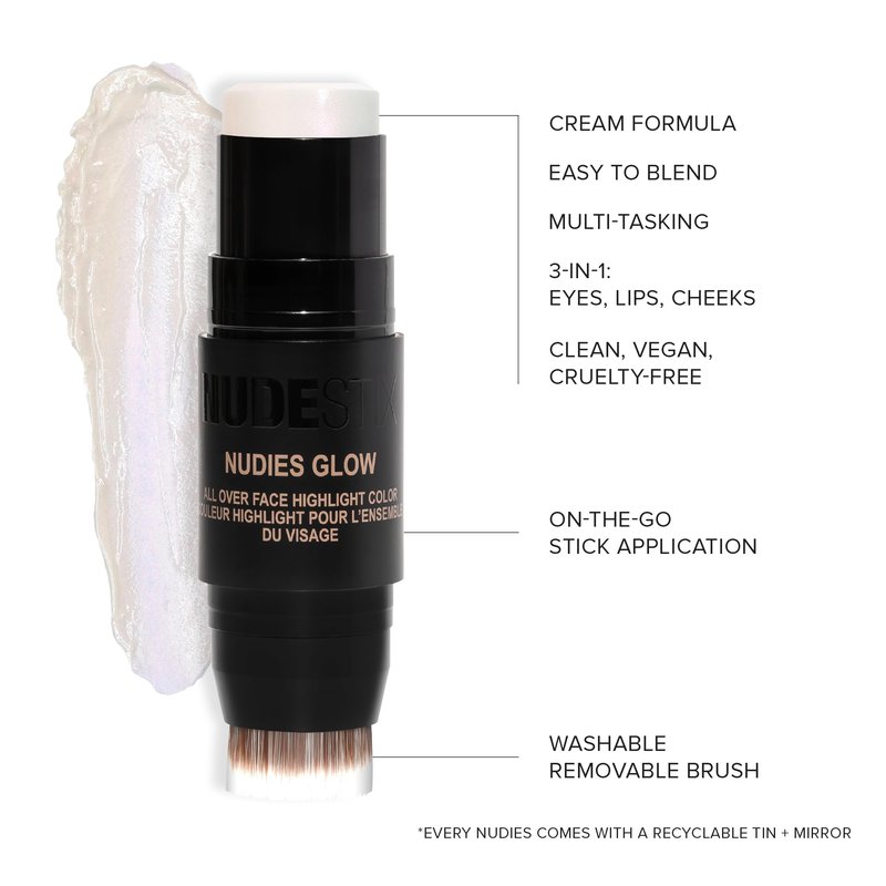 - WHAT IT IS: Nudies Highlighter Stick is a multi-use glow stick highlighter to use in every step of your makeup routine; Comes in a recyclable tin with color block on one end and blending brush on the other