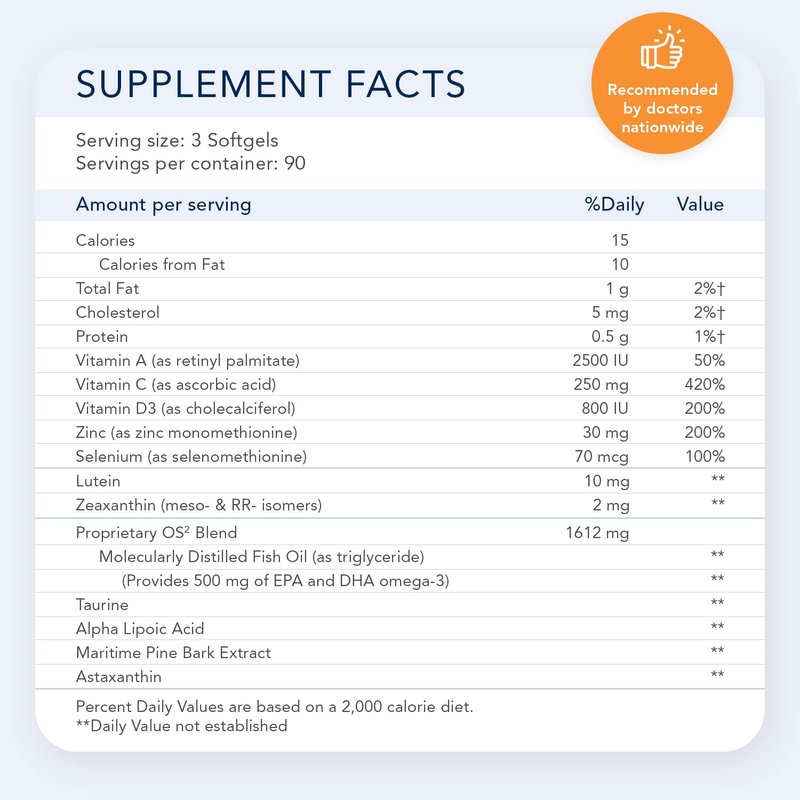 - ALL-ROUND EYE HEALTH: Recommended by doctors nationwide for its ability to better general eyesight*, decrease occasional eye dryness* and its AREDS 2 based formula for macular health, OS2 is the only vision supplement you will need. The vision support supplement combines all vital ingredients required to help improve your vision into one easy to consume softgel capsule