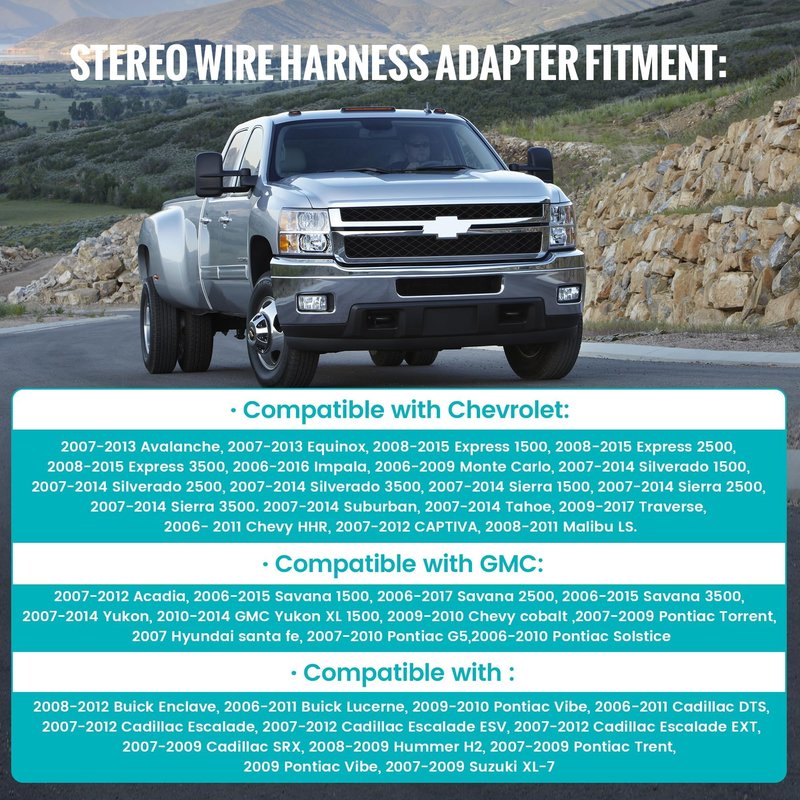 - Stereo wiring adapter for selected 2006-2017 Chevrolet, 2006-2017 Buick and 2007-2012 Cadillac. (Check compatible models on Picture 3 )