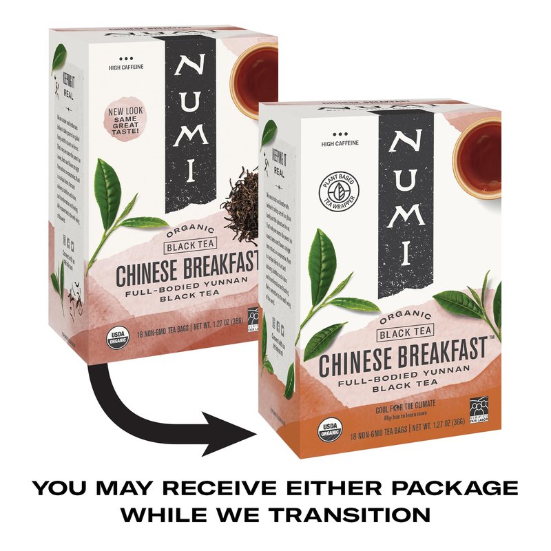 Numi Organic Chinese Breakfast Tea, 18 Tea Bags, Full Bodied Yunnan Black Tea, Caffeinated (Packaging May Vary)