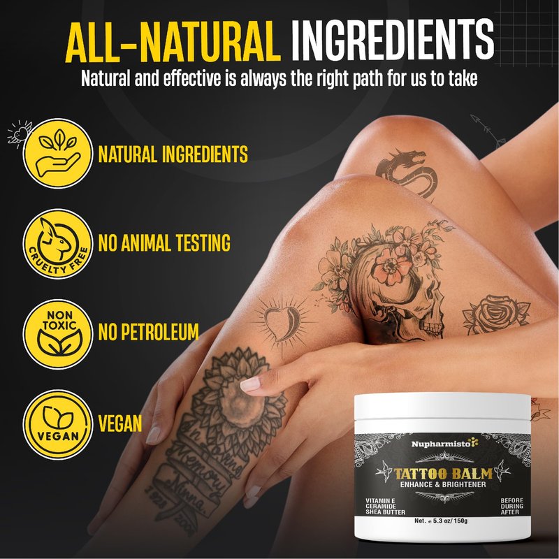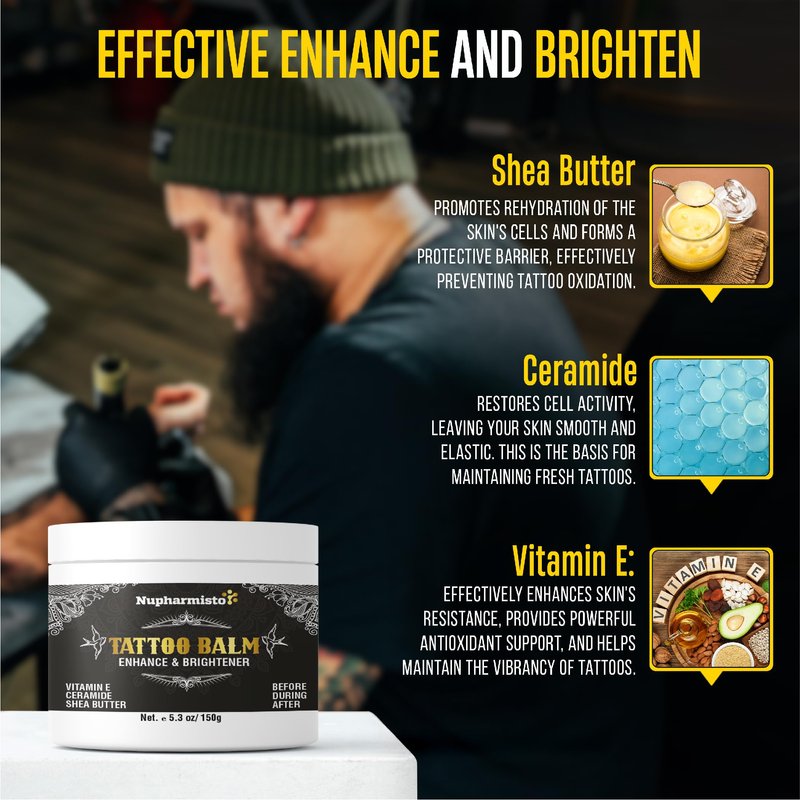 - EFFECTIVE ENHANCEMENT & BRIGHTENING: Our powerful tattoo balm, developed by a team of dedicated professionals in tattoo care, enhances the vibrancy of new tattoos and rejuvenates older ones. It prevents fading and blurring, significantly extending the life of your ink. Enjoy long-lasting, vivid tattoos.