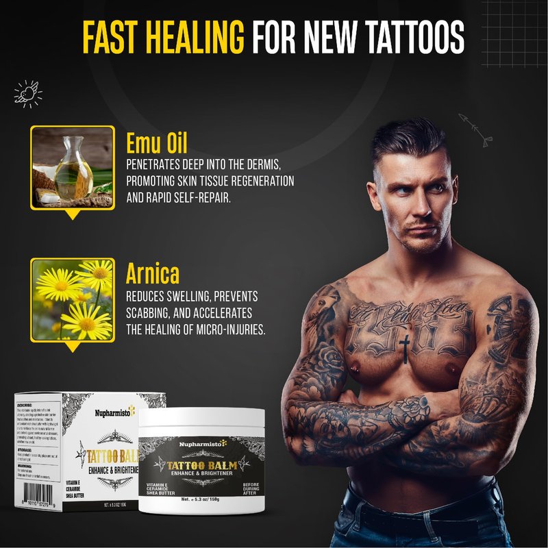- FAST HEALING FOR NEW TATTOOS: Our tattoo ointment aftercare is rich in Emu oil and Arnica Montana, our formula accelerates cell repair, reduces swelling, Prevents scabbing, and aids in the rapid healing of micro-injuries caused during the tattooing process, ensuring your new tattoos heal beautifully.