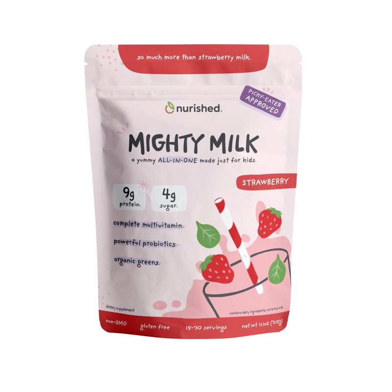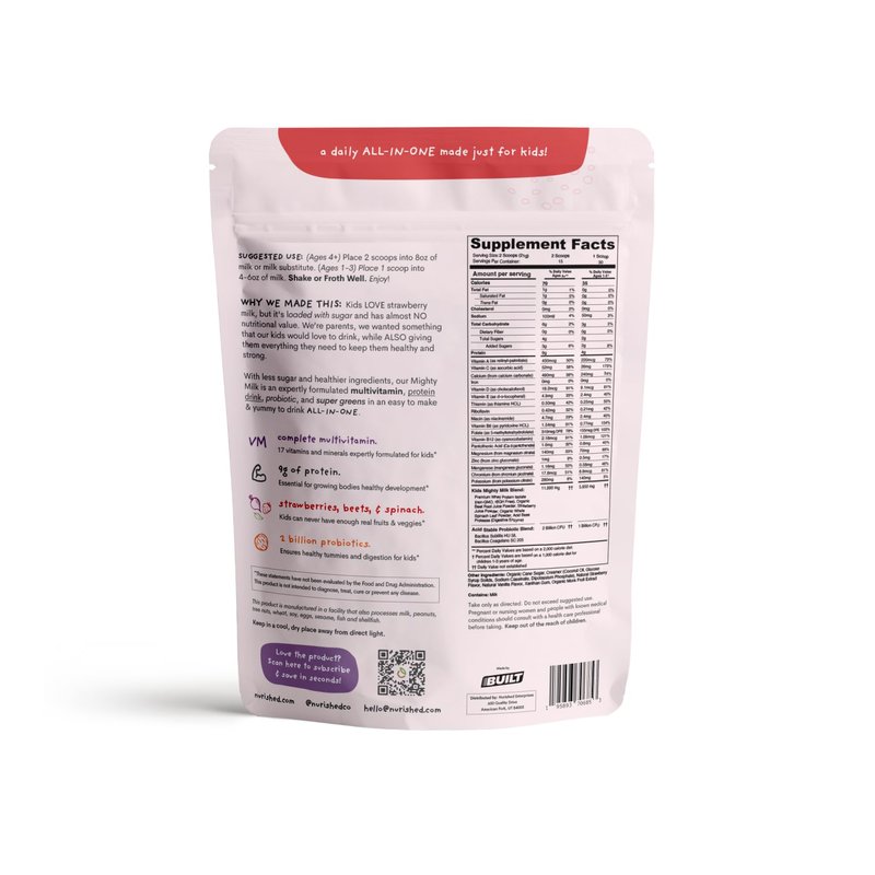 Nurished Mighty Strawberry Milk - Kids All-in-One Daily Protein Powder & Multivitamin Boosted with 2 Billion Probiotics & Organic Spinach - Natural Flavors, Colors & Sweeteners - 15-30 Servings
