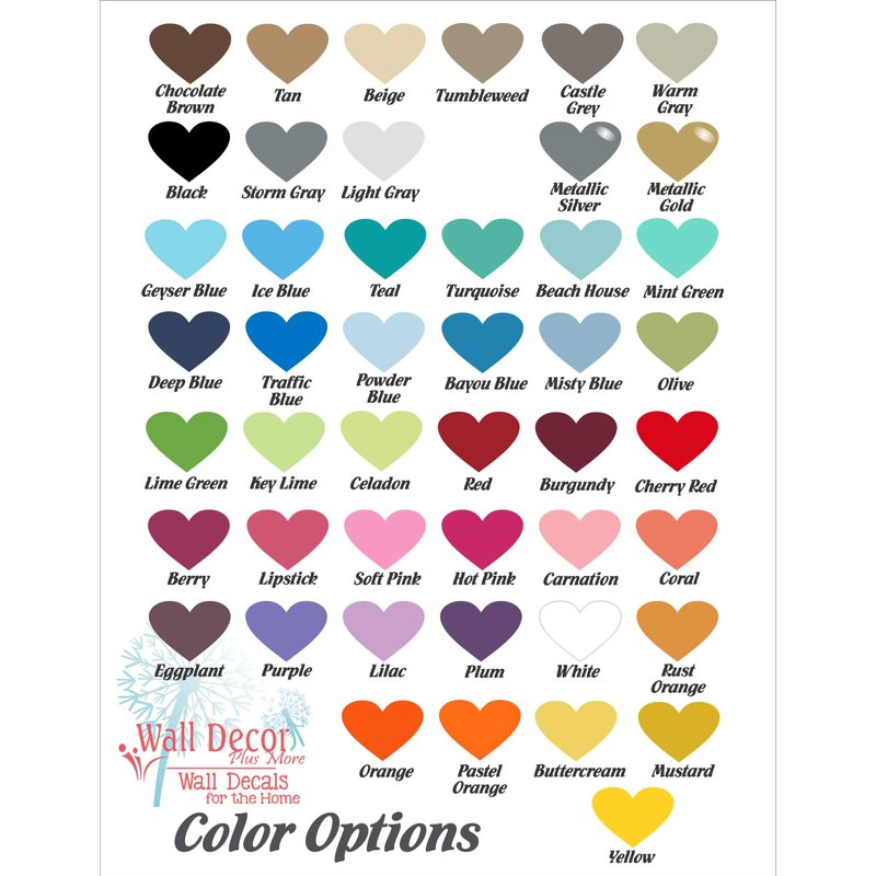 Wall Decor Plus More offers QUALITY Vinyl Wall Decals MADE IN USA. Each wall decal is cut on a cutter, the excess vinyl material is removed by hand then transfer tape is applied. No outsourcing here, the FULL PROCESS is done in the USA! These are die-cut decals. Die-cut decals do NOT have a background material like printed stickers do. Your wall or surface will be visible through and around the openings of your design. Each vinyl wall decal is premasked and packaged with detailed application instructions included. No individual letter or word alignment/installation is needed. Made from the best quality, customer-requested, matte, removable vinyl material - this matte finish makes each decal looks "painted" on. Our wall decals are designed for Home Decor surfaces, are easily removable but they are not reusable. We are a small US based (South Dakota) company and we offer a quality product at a fair price and stand behind it. Have questions? Simply call us, we will be happy to help!