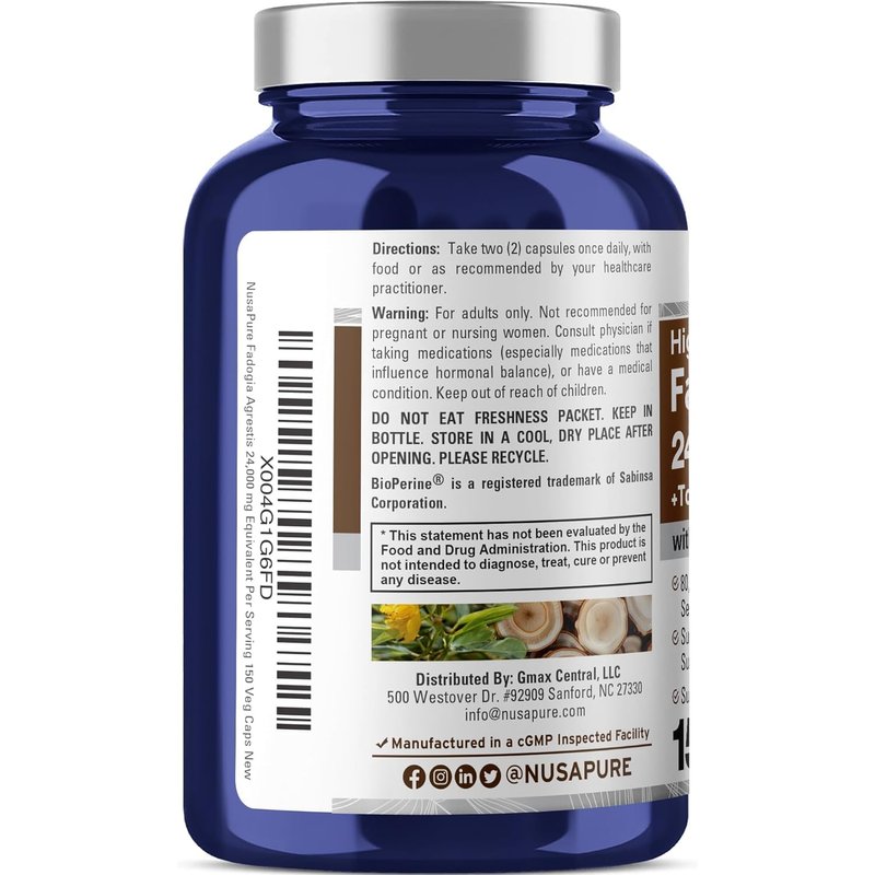 With 150 Vegeterian capsules per bottle, offering 60 servings, this game-changing product is your ultimate partner. Experience this powerful 40:1 Fadogia Agrestis extract, Tongkat Ali 200:1 Extract & BioPerine as it supports you. NusaPure ensures that each capsule delivers maximum potency and effectiveness by manufacturing each capsule in an GMP compliant facility.