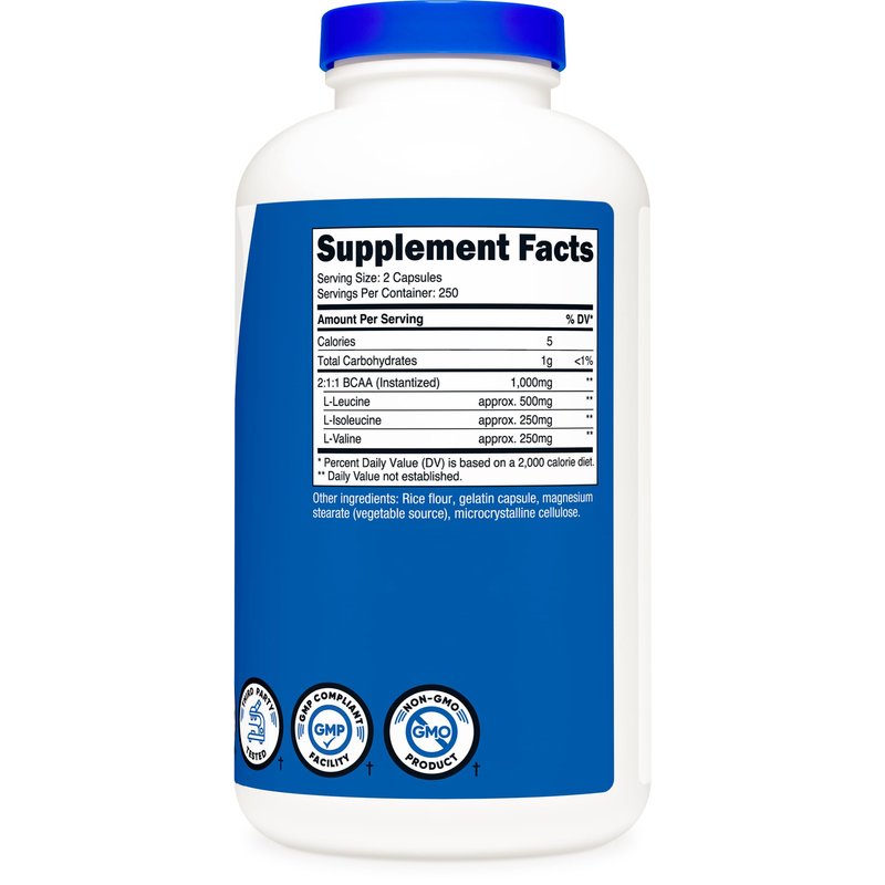 Nutricost's BCAA capsules deliver 1,000 mg of Branched Chain Amino Acids (BCAAs) per serving in the 2:1:1 ratio of Leucine (500mg) to L-Isoleucine (250mg) and L-Valine (250mg). There are 500 capsules for 250 servings per bottle. Nutricost, located and headquartered in the USA, only uses the best ingredients to ensure maximum quality and to help you feel your best! By keeping our supplement recipes simple and clean, you get the best experience possible with Nutricost. Our supplements are manufactured in a GMP-compliant and FDA-registered facility; and each batch of every product is tested by independent, ISO-accredited laboratories.
