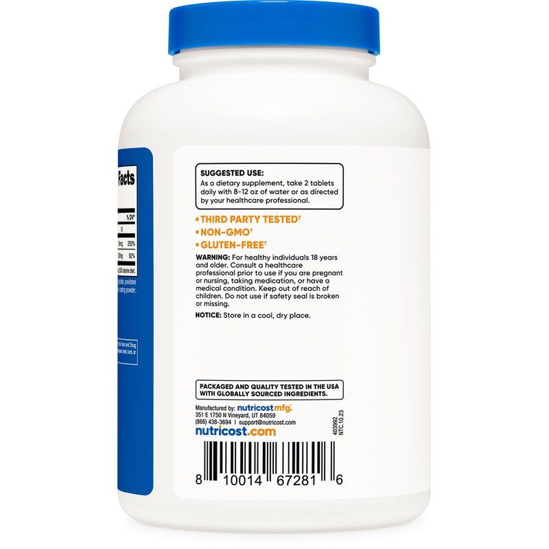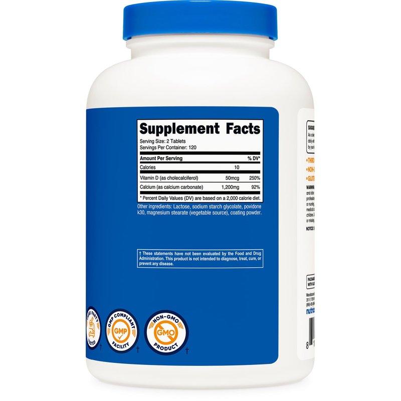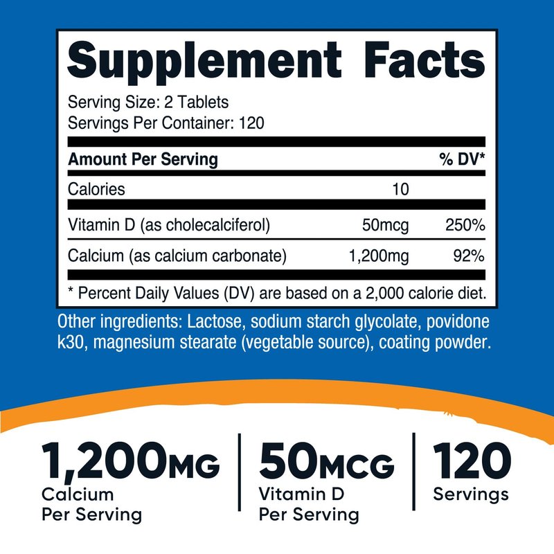 Nutricost Calcium with Vitamin D contains 1200 mg of Calcium and 50 mcg of Vitamin D. There are 240 tablets and 120 servings in every bottle.