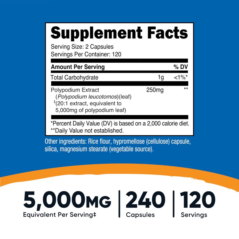 Nutricost Polypodium Leucotomos Extract (5,000mg Equivalent) 240 Capsules - Vegan, GMO-Free, Gluten-Free, 120 Servings