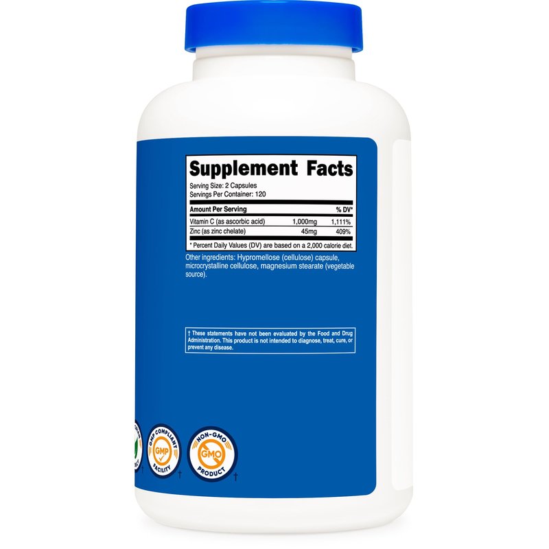 Nutricost Vitamin C with Zinc Supplement Capsules, 120 Servings - 1000mg Vitamin C, 45mg Zinc, Non-GMO, Gluten Free