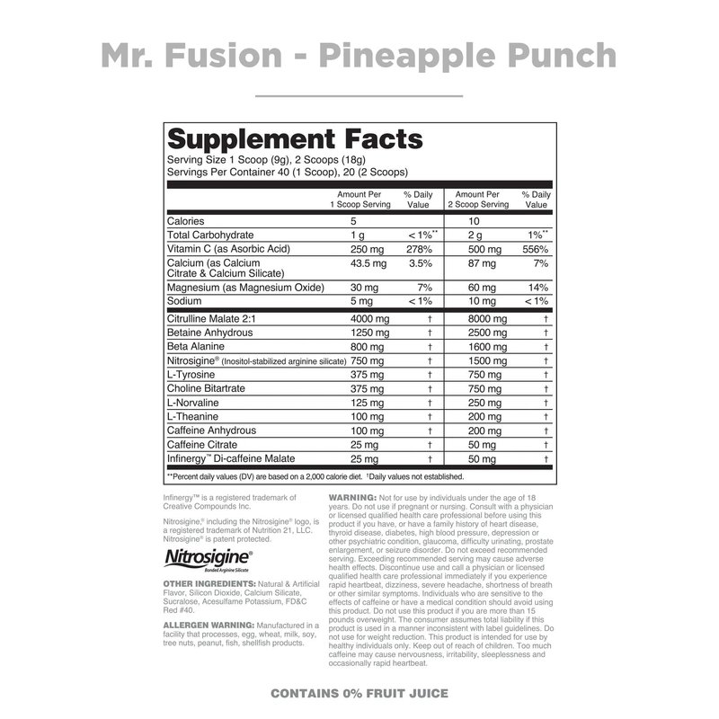 - NITRIC OXIDE BOOSTING: Mr.Fusion Pre Workout boosts muscle pumps during workouts with clinical doses of L-citrulline and betaine anhydrous, proven nitric oxide enhancers. Experience intense pumps every time you train with this top-rated pre-workout supplement.