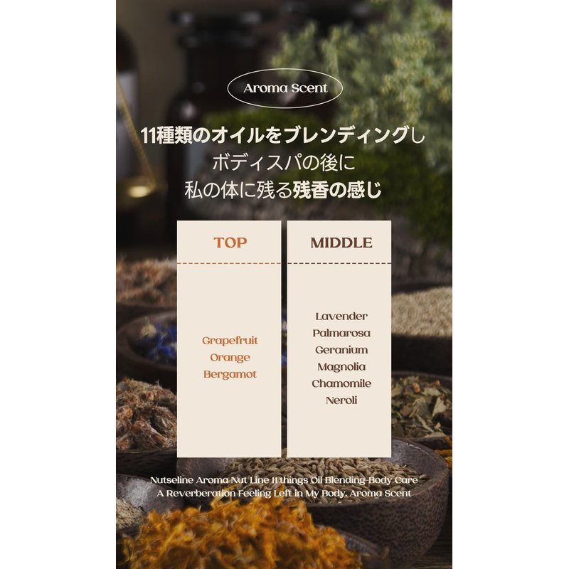 - Aroma Oil Blend : The lotion contains a blend of 11 esential aroma oils, including bergamot fruit oil, balsam copaiba oil, ginger root oil, and etc, which help to soothe and relax the skin.