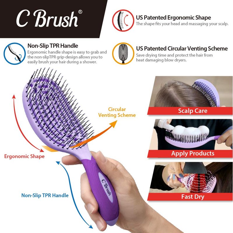 NuWay 4Hair® Patented Curved and Vented Hair Dryer Safe Detangling C Brush® (Purple)