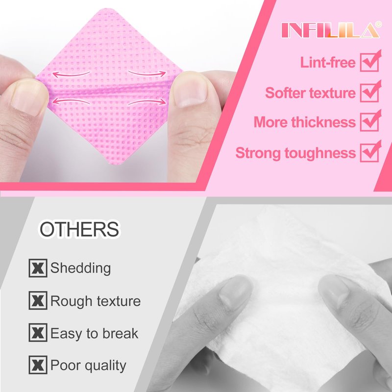 - WIDE APPLICATIONS: NXJ INFILILA wipes are worked with nail polish remover, easy-to-remove gel polish, nail polish, and acrylic nails. Can be used for wiping glue bottles of eyelash extensions, for manicure and pedicure cleaning, and will not ruin your perfect nails. Great nail art tools for professional nail studio salons, eyelash extension salons, at-home use, and personal interest.