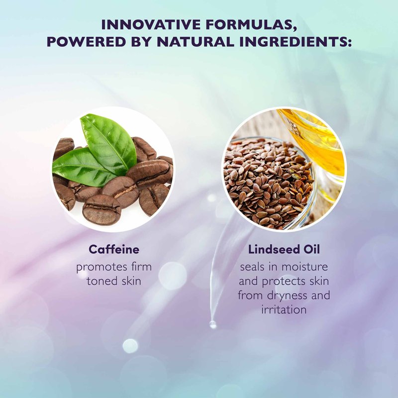 - Caffeine and Linseed Oil promotes firm skin while sealing in moisture and protection