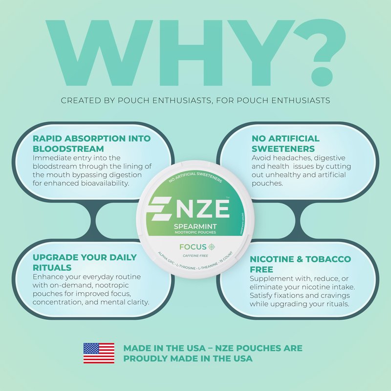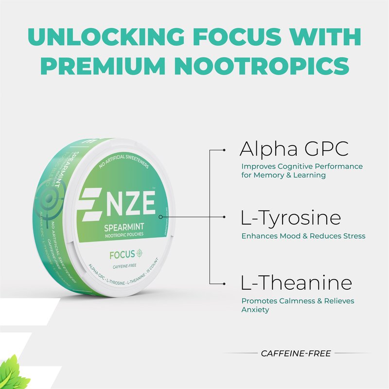 NZE Caffeine Free Nootropic Pouches (Spearmint) - Nootropic Pouches with Alpha GPC, L-Tyrosine & L-Theanine - No Sugar or Artificial Sweeteners - 15 Nicotine Free Pouches Per Can - 5 Pack