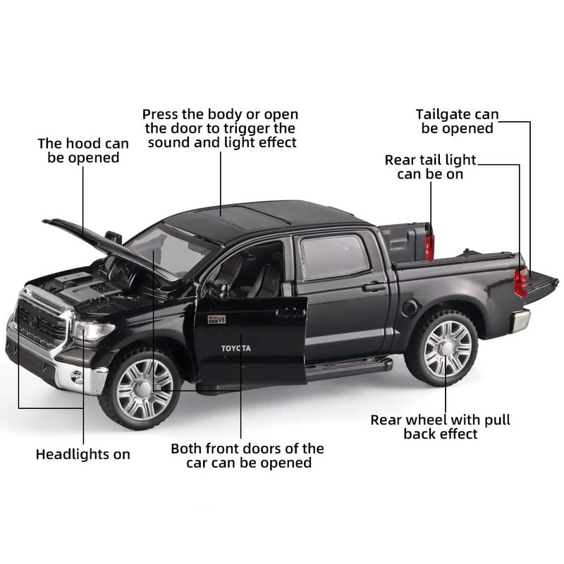 - 3.Black Tundra Pickup Truck Features:With sound and light function, press the two front wheels or open the front door to trigger sound and light,Both front doors, hood and tailgate can be opened,Both front lights and rear tail lights can be illuminated,The rear wheel of the toy pickup truck has a pull-back function.