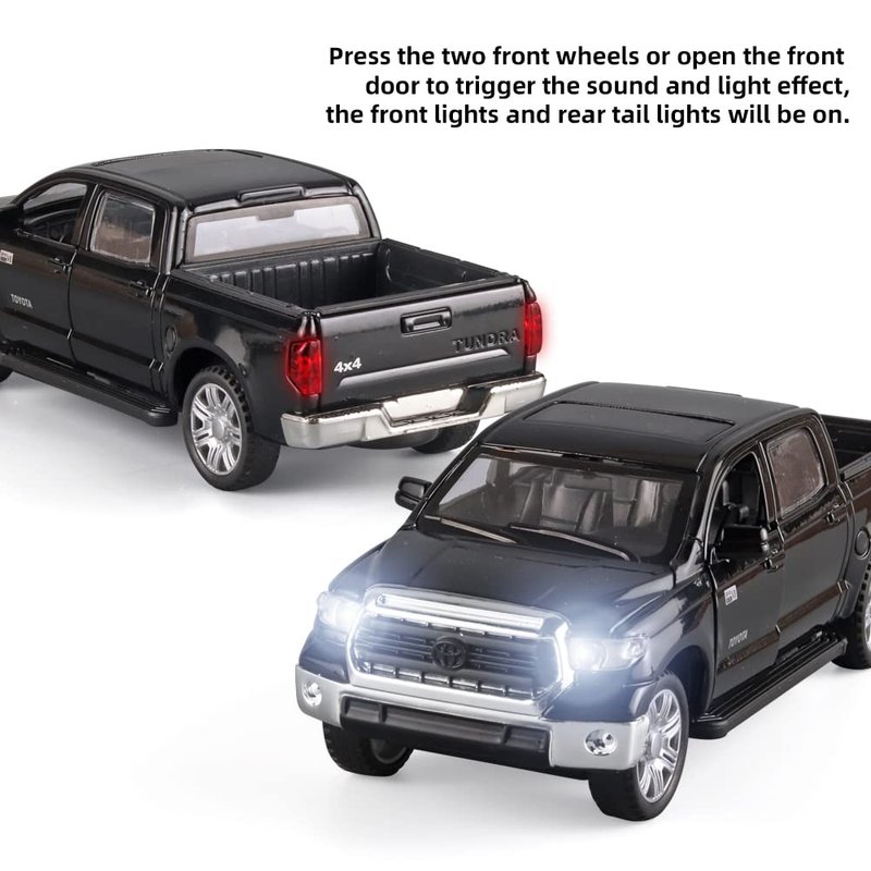 Tundra toy pickup truck is made of zinc alloy material and ABS plastic, and zinc alloy body, interior and chassis are made of ABS plastic. Two front doors, hood and tailgate can be opened, which have sound and light effects. Pressing the two front wheels or opening the door triggers sound and light effects. The front lights and rear taillights can be lit, and the rear wheels have a pull-back function. This model has fine workmanship, which is very suitable for children's gifts or car model lovers' collection, and is the best choice for gifts.