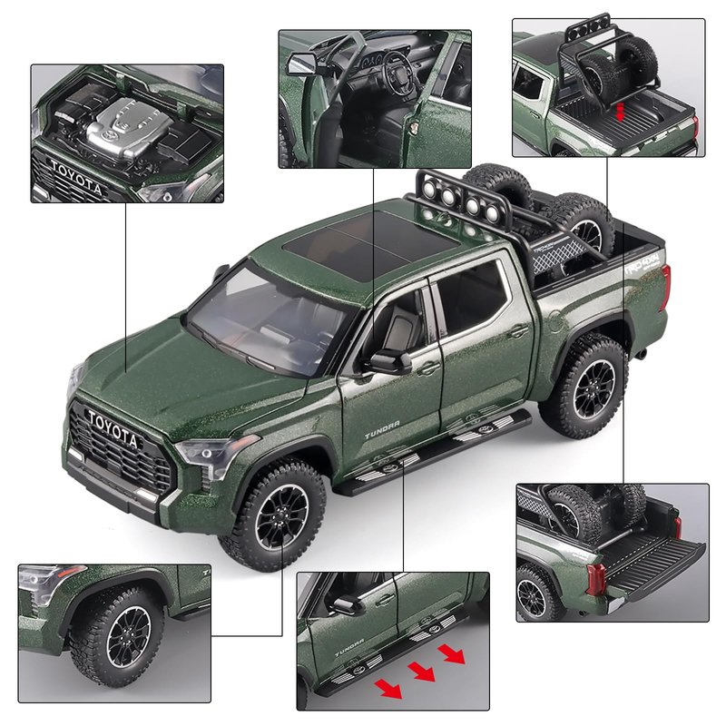 Tundra Toy Trucks is made of zinc alloy + ABS plastic, and the zinc alloy body, interior and chassis are all ABS plastic.With simulated sound and light effects,press the body or press the steering wheel to trigger the sound and light effect,the front lights and rear tail lights light up and trigger the sound effect.Doors, hood and tailgate all open,front wheels can turn left and right,the rearview mirror can be folded,retractable pedals on both sides,the tire rack can be freely disassembled.Four wheels with shock absorbing effect,the rear wheel has a pull-back function.Tundra toy pickup truck fine workmanship,very suitable for collection by children or car model lovers, and is the best choice for gift giving.
