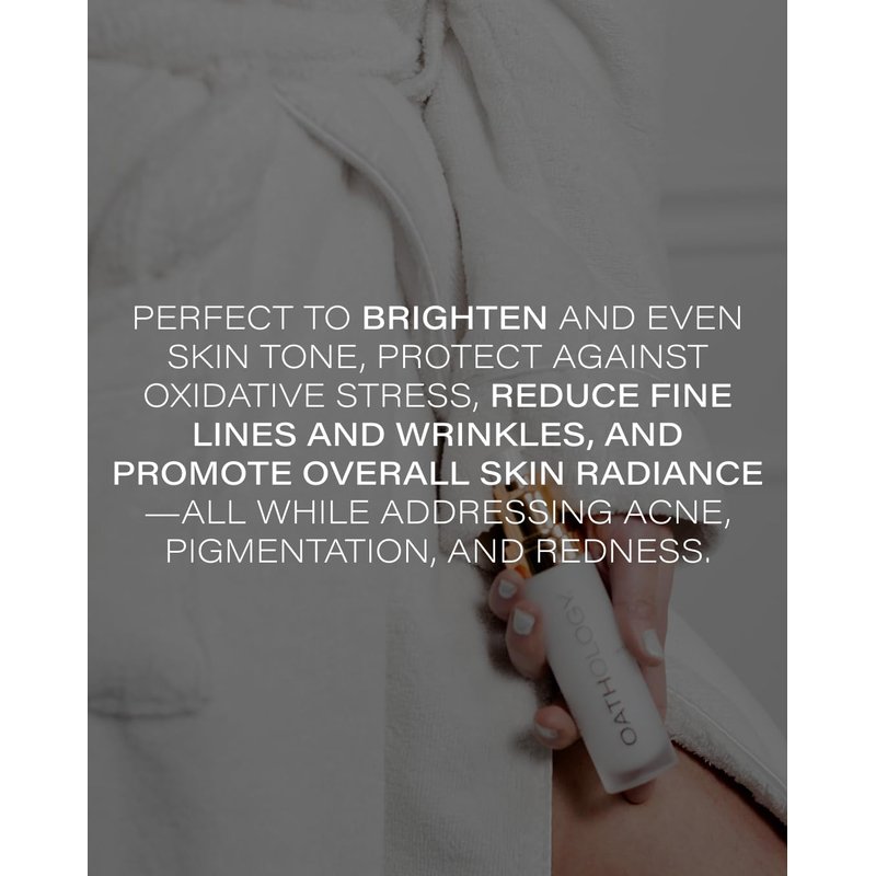 Oathology's unique serum combines Vitamin C, Tumeric, Tranexamic Acid and Peptides in a comprehensive serum designed to brighten the skin in addition to helping neutralize free radicals from sun exposure and our daily environment. What makes it coveted? Oathology made this product with our patients in mind. We understand it is hard to find a Vitamin C serum that can deliver and not irritate, this is our solution to that problem. It is the ultimate combination of brightening and protective elements for all skin types. Who can use this product? Ideal for: Anti-Aging Sensitive skin Rosacea prone Hyperpigmentation prone Melasma prone Oily skin Acne prone Pregnancy friendly Dermatologist crafted skincare: Skincare Created with Healing at the Forefront Recommended use with Oathology Inzincable Tinted Mineral Sunscreen, SPF 50. Manufactured and Distributed in the USA by board certified dermatologists. Oathology.com
