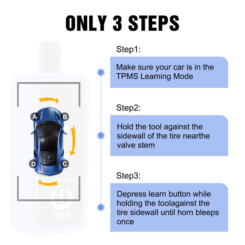 - 🚐ONLY 3 STEPS: 1. Make sure your car is in the TPMS Learning Mode, 2. Hold the tire sensor tool against the sidewall of the tire, near the valve stem. 3. Depress learn button while holding the tool against the tire sidewall until horn bleeps once.