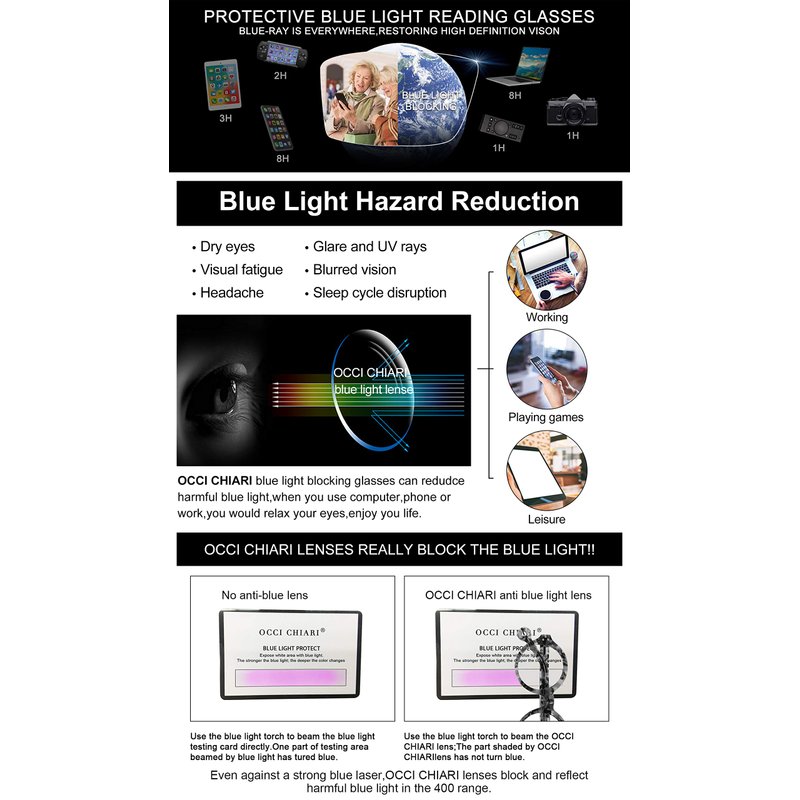 - Blue light blocking glasses women: A-class Blue light Gaming glasses women can cut most of blue light. The blue light lens can improve contrast, reduce chromatic aberrations, restore true colors. Relieving your eye strains and headache for reading, watching TV, gaming, using computer or mobile phone.