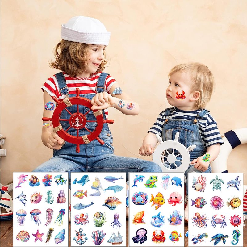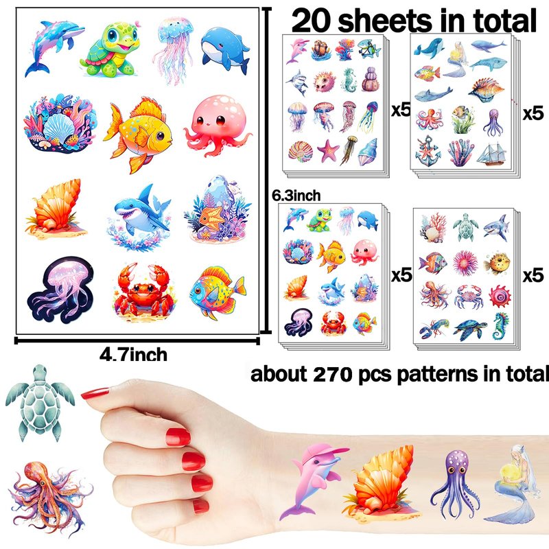 - Ocean Animals Temporary Tattoos for Kids: This sea life tattoo stickers has 4 styles, 5 sheets in each style, 20 sheets in total; Each tattoo sticker includes about 13 different patterns, about 270 patterns in total; The styles are very rich, and sufficient quantity is enough for your daily use and replacement;