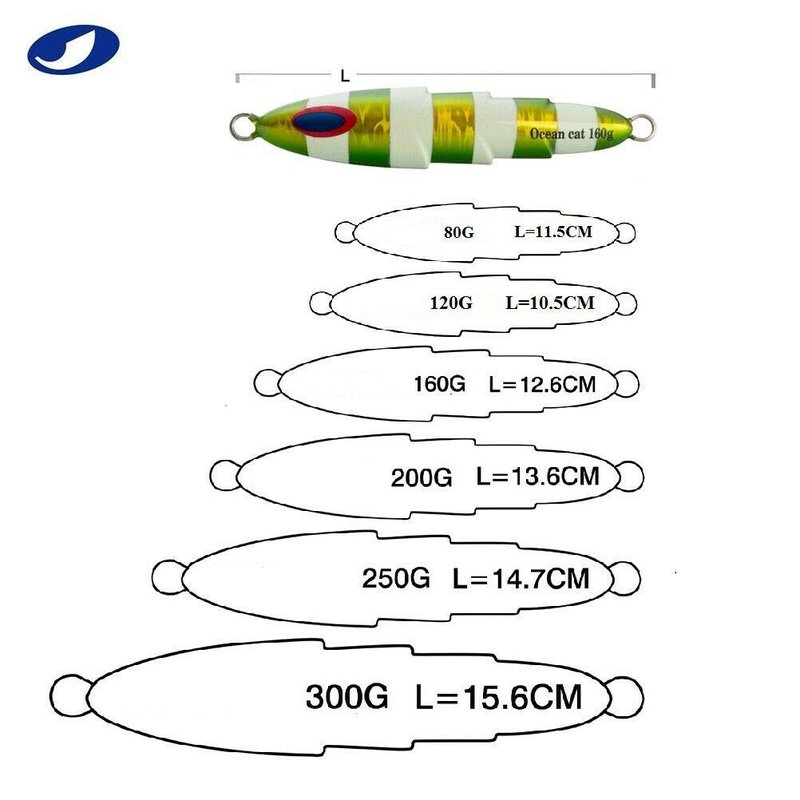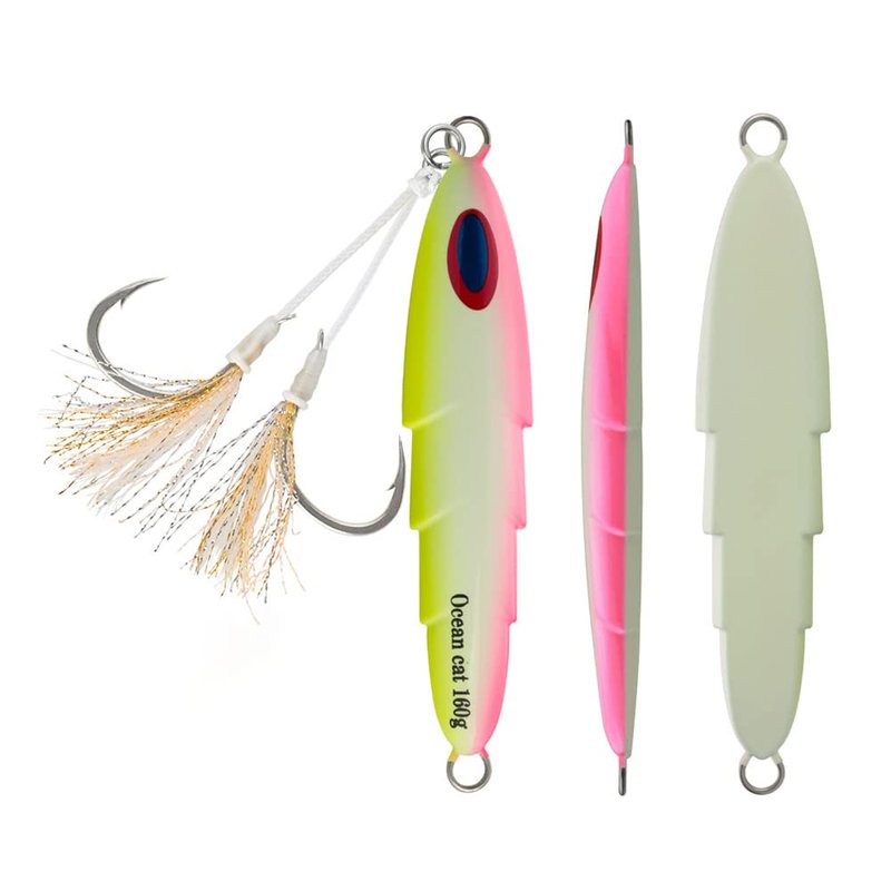 - DESIGN: OCEAN CAT lead metal flat slow fall pitch fishing jigs Lures have jagged body with attractive bright colors ,ideal for reflecting light and attracting fish from a significant distance.Glow in the dark,which can be more attractive to target fish.The front and back of jigs are asymmetric, it will present a multiple actions under water.
