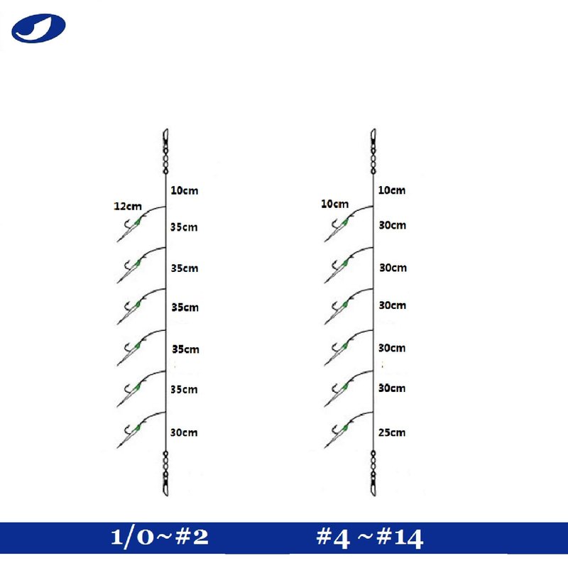 - SPECIFICATION: Size:2/0#,1/0#,1#,2#,4#,6#,8#,10#,12#,14#.10 Packs/Package.each pack including 6 rigs with hooks rigged well, glow beads on the bottom of hooks, and swivels on the end of fishing line.