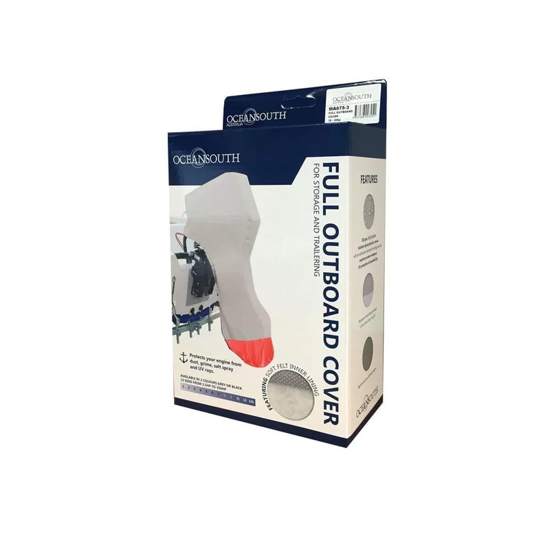 The Oceansouth Universal Full Outboard Cover is a heavy-duty solution crafted to offer complete protection for your engine cowling against dust, grime, and the damaging effects of UV rays. This versatile cover accommodates both 2-stroke and 4-stroke engines, ranging from 2.5hp up to 350hp, ensuring thorough protection during trailering or storage. Crafted from UV-resistant polyester fabric with water-repellent properties, this cover safeguards your outboard engine from the elements. With reinforced top-stitched seams and a zip-up leg section complemented by a drawstring, this cover provides a secure and snug fit, offering optimal protection against water, sun, and grime during transportation or while your boat is in storage. Made from ATLAS premium woven dope-dyed polyester fabric, this Universal Full Outboard Cover is built for durability and longevity, making it an essential accessory for safeguarding your valuable outboard motor.