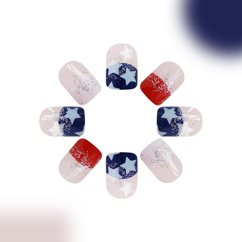 4th of July press on nails with star fake nails extra short square red blue glossy false nails design.They made of high-quality glossy acrylic,it provides a durable and long-lasting choice for women daily nail decoration.These easy to apply nails can enhance your usual look,aiming to effortlessly and elegantly enhance your style.