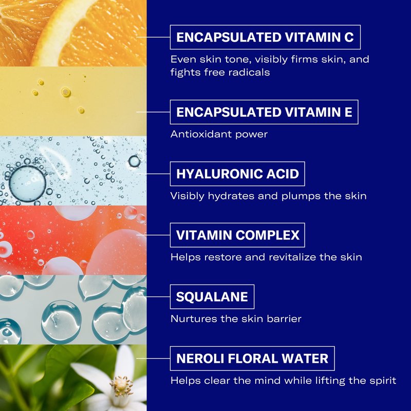 - Ingredient Power: Encapsulated Vitamin C regulates melanin to even skin tone, boosts collagen production for visibly firm skin, and fights free radicals. It’s paired with Encapsulated Vitamin E for dual antioxidant power. Hyaluronic Acid visibly hydrates and plumps the skin. Our nutrient-rich dose of Vitamins A, B, D, and E helps restore and revitalize the skin, while Squalane nurtures the skin barrier. Neroli Floral Water helps clear the mind while lifting the spirit.