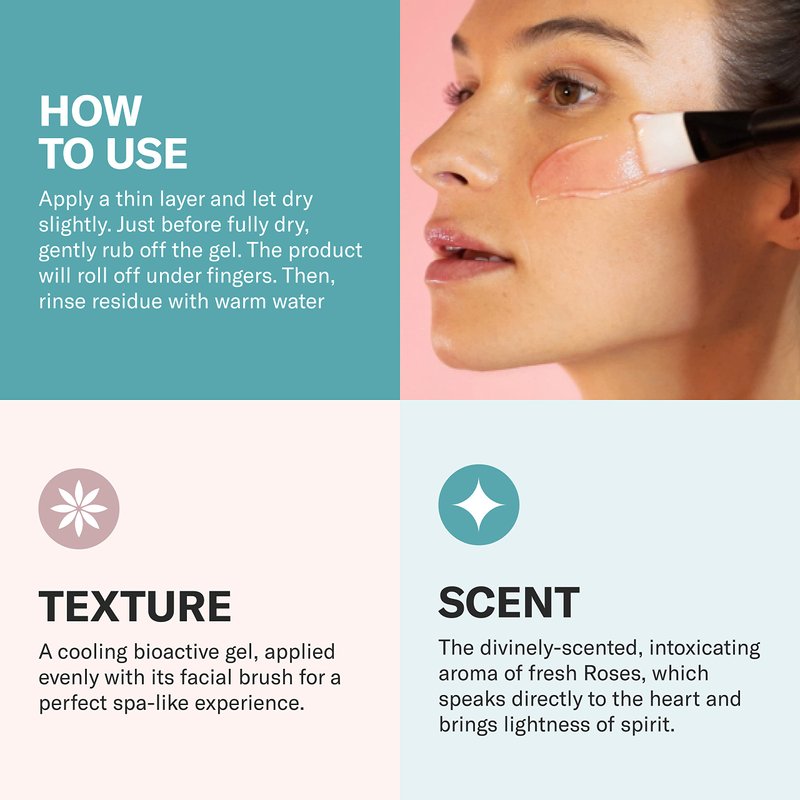 WHAT IS GOMMAGE Gommage [erase in French] is a professional-type facial exfoliation method - a French spa favorite. This enzyme-rich gel is uber-effective at helping resurface the skin, and super satisfying to use. See APPLICATION for how-to. INGREDIENT POWERS Like little Pac-Mans, Pineapple and Papaya Enzymes thoroughly work at eating up dead skin, without hurting new skin. The appearance of skin texture is instantly improved and dull and tired complexions are refreshed. Hyaluronic Acid acts like a mini hydrating mask and helps loosen hardened impurity build up to make removal more effective. Konjac Root brings purifying and hydrating properties, helping to keep complexion fresh and clear. Rose Water envelopes both skin and mind in a divine soothing and relaxing state. Fabulous for all skin types, this divinely Rose-scented BIOACTIVE ROSE GOMMAGE is the ultimate resurfacing multitasker that can be used as a GOMMAGE or MASQUE.