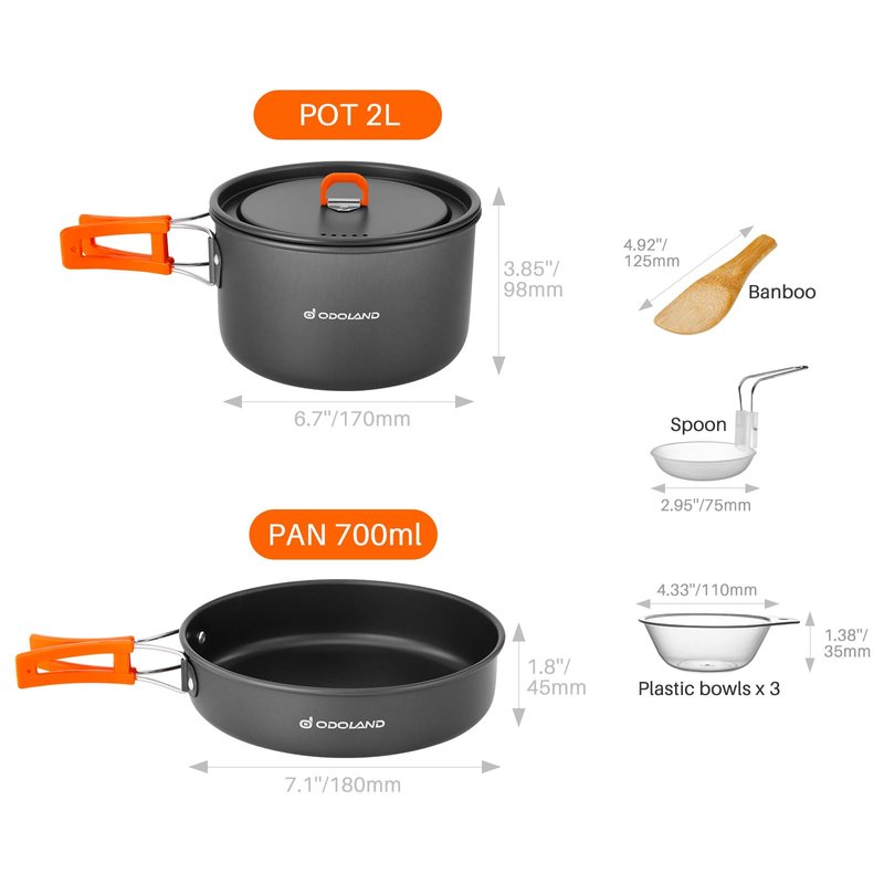 - The Best Money You Ever Spent - The 9pcs camping cookware set includes 1 x 1L pot, 1 x 0.55L fry pan, 3 x plastic bowls, 1 x soup spoon, 1 x banboo spatula, 1 x cleaning sponge and 1 x mesh bag. A great choice for hiking, backpacking, camping or any other activity.