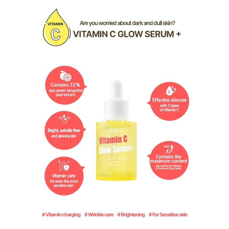 NET VOL. 30 ml / 1.01 fl oz Introducing O! GET! Vitamin C Glow Serum Plus, a skincare marvel crafted for luminous, wrinkle-free, and vibrant skin. Enriched with an impressive 72% Jeju green tangerine peel extract, this serum packs a Vitamin C punch ten times more potent than lemon. The eco-friendly cold brew method extracts Vitamin C, polyphenols, and flavonoids from upcycled Jeju green tangerines, ensuring a radiant complexion with each application. This serum goes beyond conventional Vitamin C treatments, offering a triple Vitamin C blend and 10 vitamin complexes. Together, they synergistically revitalize and clarify the skin, combating fatigue from external stressors and the aging process. The inclusion of 5% niacinamide, approved by the Ministry of Food and Drug Safety, enhances its powerful skin brightening effect. Additionally, Glutathione and Bisabolol contribute to a maximum content of approved skin brightening ingredients. Experience the magic of patented triple hyaluronic acids that lock in moisture, providing powerful hydration through a water-holding mechanism. This serum's specialty polymers ensure your skin stays brighter, more hydrated, and enriched with essential nutrients. Designed with sensitive skin in mind, this hypoallergenic serum boasts a slightly viscous liquid texture, leaving your skin refreshed without any stickiness. Elevate your skincare routine by applying an appropriate amount after toner, following the direction of your skin's texture. Unleash the radiant potential of your skin with O! GET! Vitamin C Glow Serum Plus.