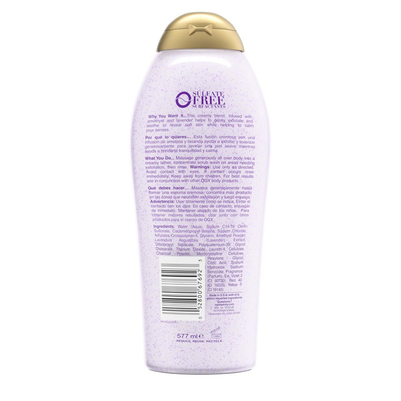 - CALMING SCRUB: Gently exfoliate & recharge with OGX Calming + Amethyst & Lavender Body Scrub & Wash