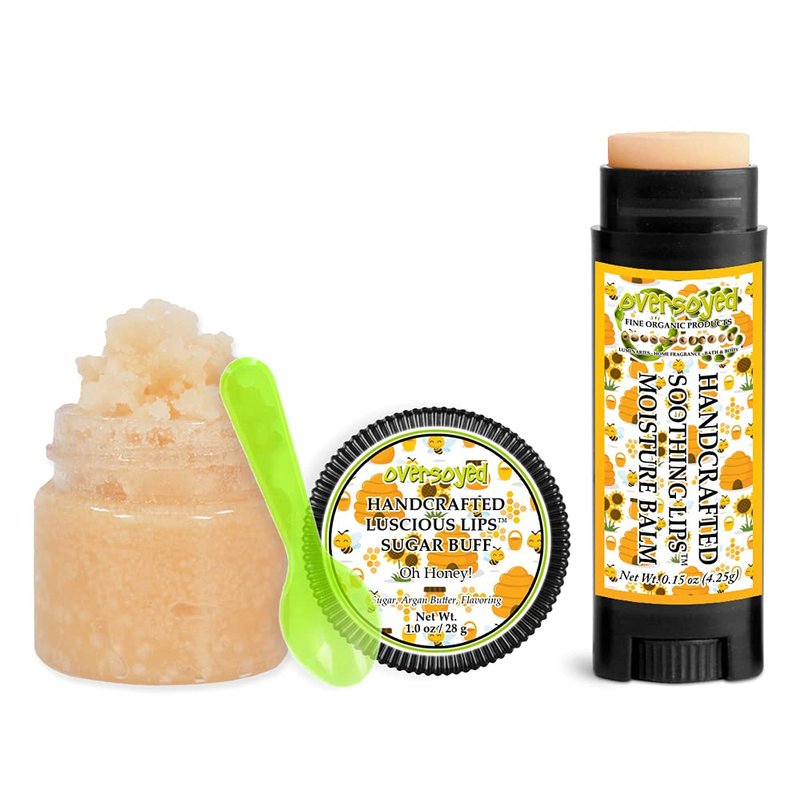 Oh Honey! Soothing & Luscious Lips by OverSoyed Exfoliator & Chapped Lip Repair Lip Care Combo | Artisan Handcrafted to Order Sweet Honey Floral Tupelo Flavored Exfoliating Sugar Lip Scrub & Lip Moisturizer Balm Gift Set