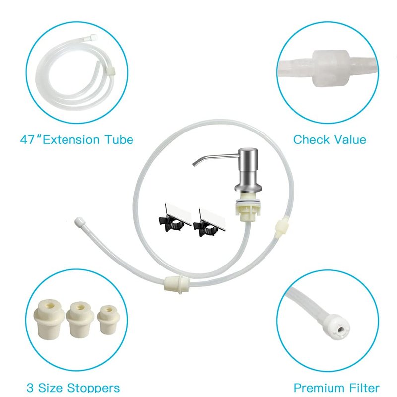 - 【Multipurpose Use】: The extension tube kit made with food-grade silicone tube 47'' is soft and flexible, check valve make it easier to pump out the soap, keep soap primed at the top of the tube, and the three stoppers make it fit all kinds of containers or bottles. It also can be used as follow: hand soap, liquid dish soap, shampoo, shower gel, or even hand-lotion or moisturizer ideal for kitchen, hotel or commercial uses.
