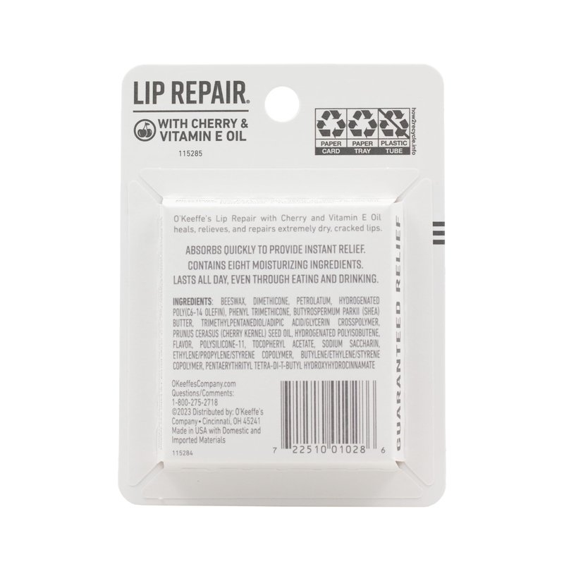 - O'Keeffe's Lip Repair with Cherry & Vitamin E oil heals; relieves and repairs extremely dry cracked lips