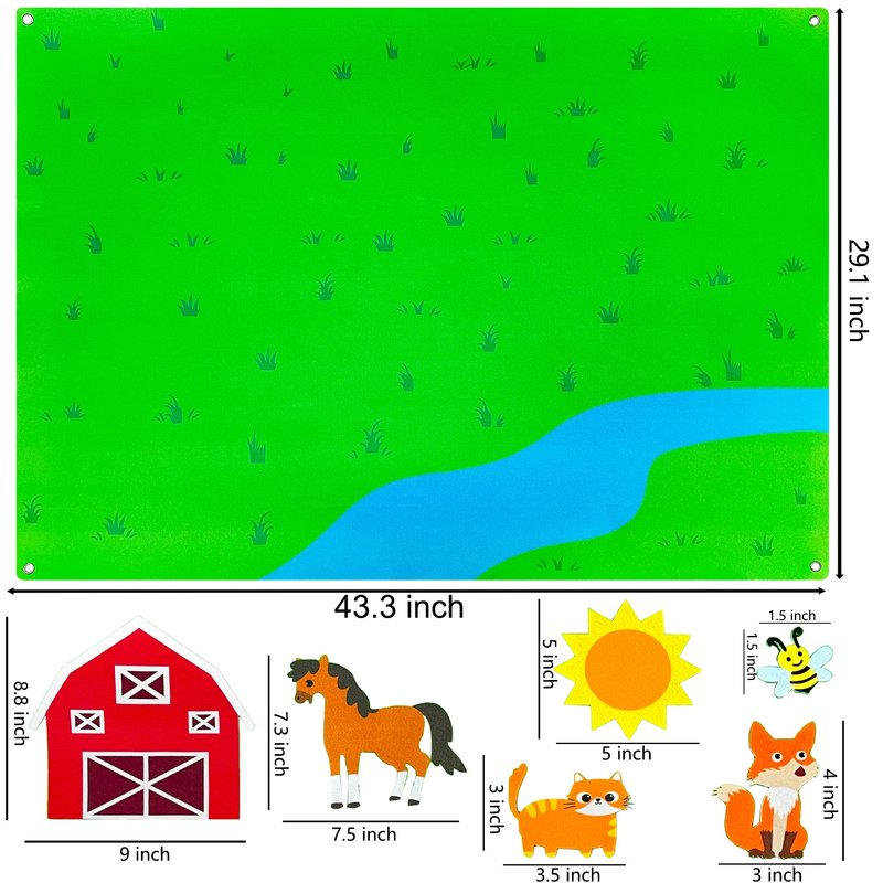 - FARM THEMED TOY SET: 3.6-foot (43.3 x 29.1-inch) oversized felt background board. 55 pieces of felt accessories, suitable for children's small hands, These interactive felt accessories can be placed and reused on the felt board at will. 4 powerful hooks and 1 spare hook can easily hang the felt background plate. 1 piece of sandpaper.