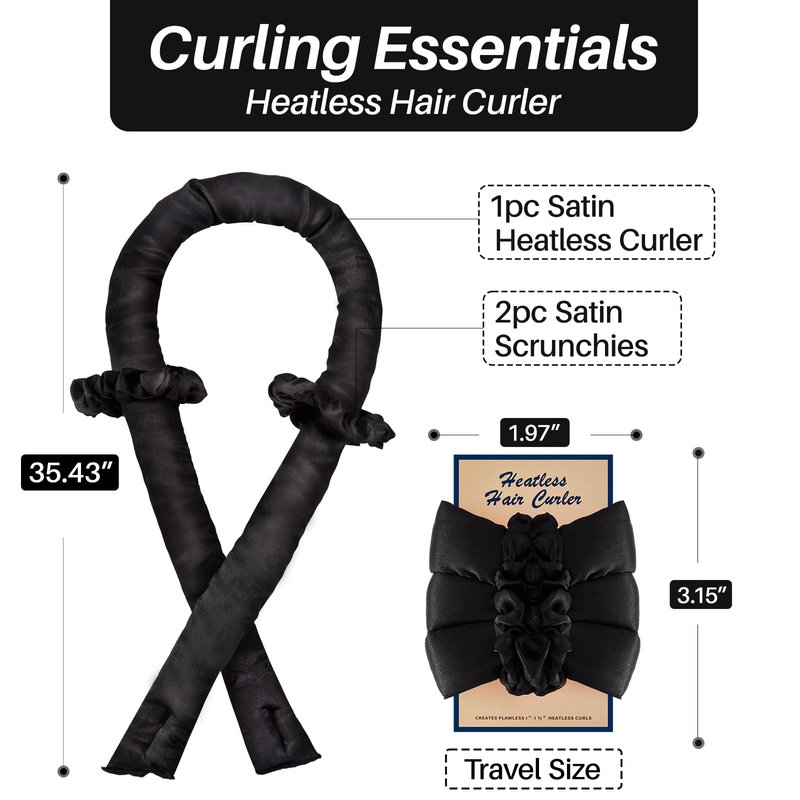 Experience glamorous curls with our heatless hair curler, featuring cotton inside and silk outside for healthy curls. Achieve classic looks effortlessly without heat damage using our heatless curling headband. Say goodbye to hair damage with our set, including one curling rod and two Scrunchies, designed for optimal curling without harm. Suitable for all hair types, our 35.43" heatless curls headband covers straight to wavy, long to medium-length hair. Conveniently travel with our set, complete with a satin bag for beauty on the go. Surprise her with our Satin Heatless Curling Set, the perfect gift for girlfriends, moms, or daughters, offering effortless curls without scalp damage. Enjoy overnight heatless curls for beauty anytime, anywhere.