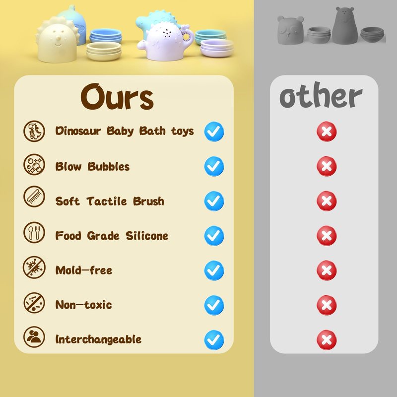 Let the cute little dinosaur accompany your baby's bath time! This product uses food grade silicone, and does not contain BPA or phthalate. Our product has passed CPC test, giving your baby peace of mind. This product has a simple two-piece design for easy cleaning. In this way, reduce your cleaning burden. The unique dinosaur shape is cute and interesting, and it can squeeze and blow bubbles to exercise the baby's grasping ability. It comes with a soft silicone brush to promote your baby's tactile development. We hope that every baby can have a childhood full of love and imagination, and hope that our products bring joy to your life.