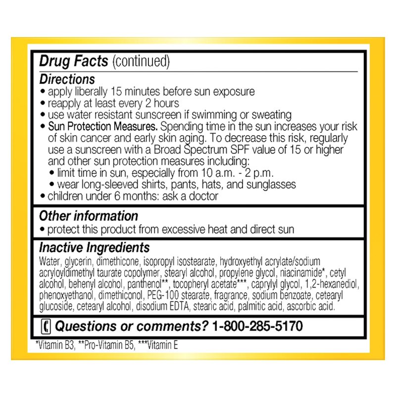 - Daily facial moisturizing cream helps prevent premature skin damage with Broad Spectrum SPF 15 UVA/UVB sunscreen