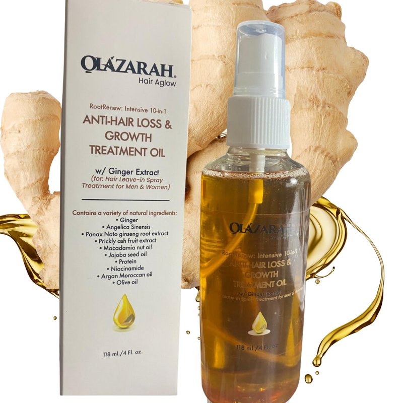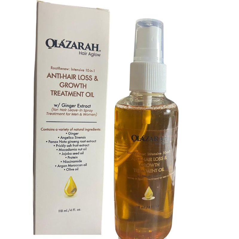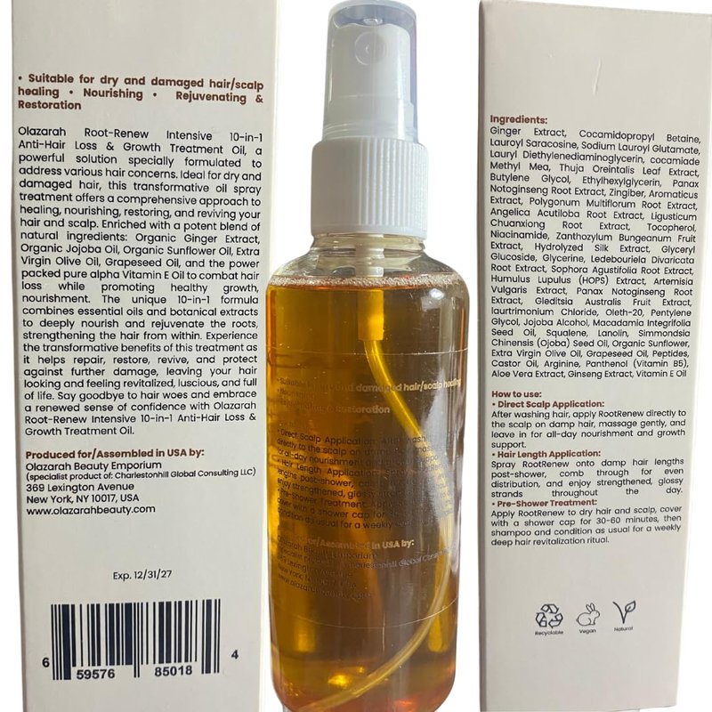 Olazarah Root-Renew Intensive 10-in-1 Anti-Hair Loss & Growth Treatment Oil, a powerful solution specially formulated to address various hair concerns. Ideal for dry and damaged hair, this transformative oil spray treatment offers a comprehensive approach to healing, nourishing, restoring, and reviving your hair and scalp. Enriched with a potent blend of natural ingredients: Organic Ginger Extract, Organic Jojoba Oil, Organic Sunflower Oil, Extra Virgin Olive Oil, Grapeseed Oil, and the power packed pure alpha Vitamin E Oil to combat hair loss while promoting healthy growth, nourishment. The unique 10-in-1 formula combines essential oils and botanical extracts to deeply nourish and rejuvenate the roots, strengthening the hair from within. Experience the transformative benefits of this treatment as it helps repair, restore, revive, and protect against further damage, leaving your hair looking and feeling revitalized, luscious, and full of life. Say goodbye to hair woes and embrace a renewed sense of confidence with Olazarah Root-Renew Intensive 10-in-1 Anti-Hair Loss & Growth Treatment Oil.