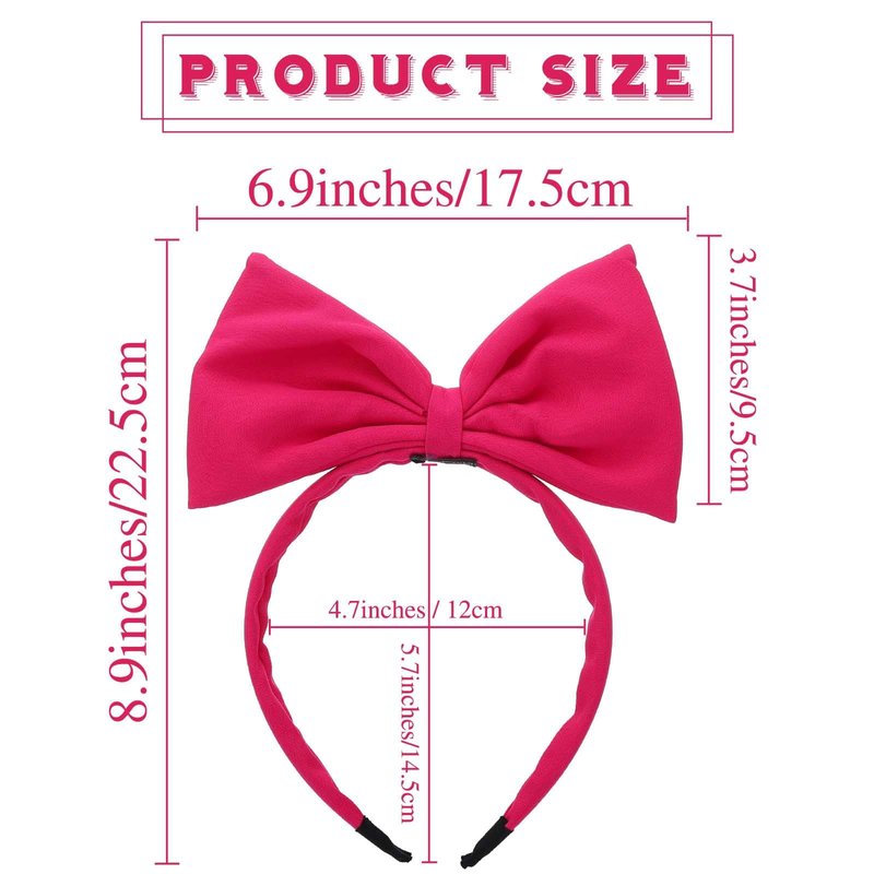 - Pink headbands with bow are approx 8.9*6.9 inches / 22.5*17.5 cm(Bow:6.9*3.7 inches/17.5*9.5 cm ; Hair Hoop : 4.7*5.7 inches / 12*14.5 cm).Costume bow is glued to centered of the red bow headband , making the overall shape more cute,and the pink hair bow is not removable.