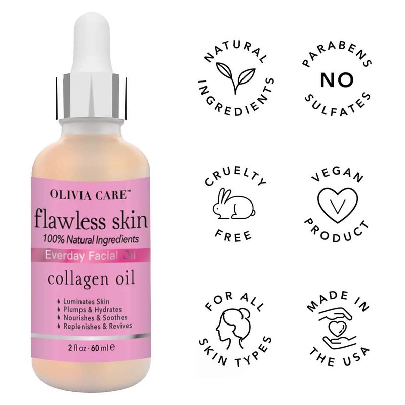 - NATURAL NOURISHMENT: Immerse your skin in the pure goodness of OLIVIA CARE Flawless Essential Collagen Facial Oil. 100% natural ingredients work together to provide nourishment, leaving your skin feeling rejuvenated and plump.