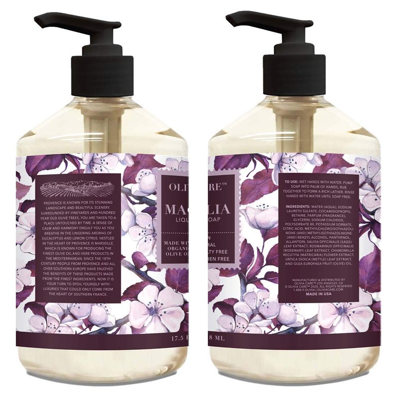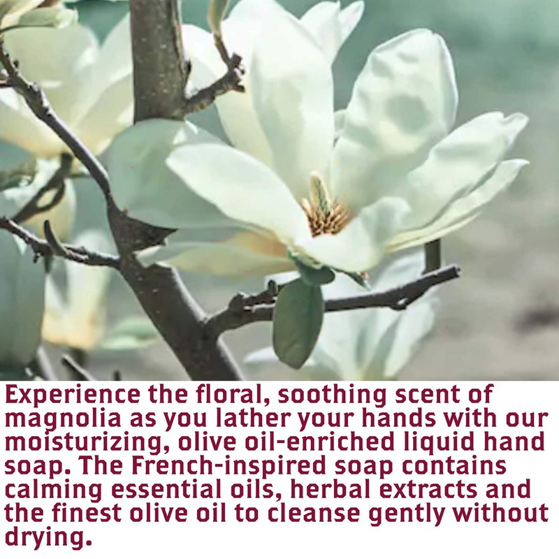 - ✅ INFUSED WITH MAGNOLIA & ESSENTIAL OILS: Experience the floral, soothing scent of magnolia as you lather your hands with our moisturizing, olive oil-enriched liquid hand soap. The French-inspired soap contains calming essential oils, herbal extracts and the finest olive oil to cleanse gently without drying.