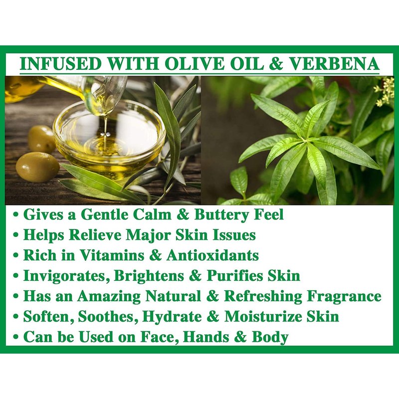- INFUSED WITH OLIVE OIL & VERBENA: Olive oil is known to be a perfect skin Moisturizer and gives a very clean and buttery feel. It gives a very gentle and clean feel to skin and help in relieving Eczema and Psoriasis and Acne. Verbena in Soap is known to Purify, brightens and helps in treating Puffiness of the skin and provides a nice scent.