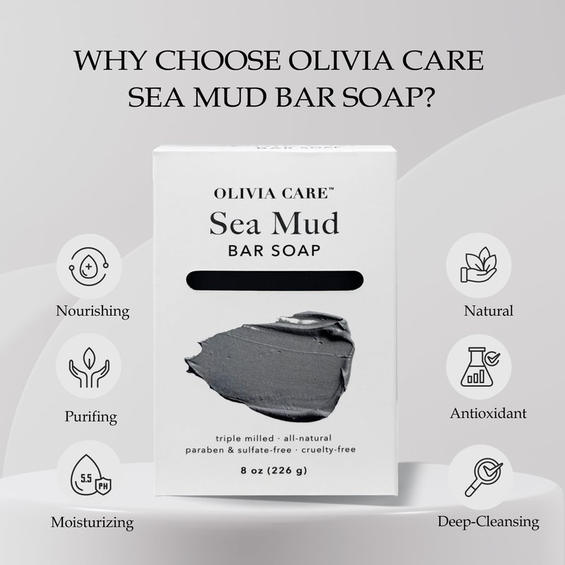 - INFUSED WITH DEAD SEA MUD: Olivia Care Sea Mud Soap is known to help improve psoriasis, dead skin and reduce skin Impurities. It is beneficial for dry, oily and normal skin types. Our soap removes dead cells from the skin’s surface, purges the pores of impurities, and balances the skin’s oil production.